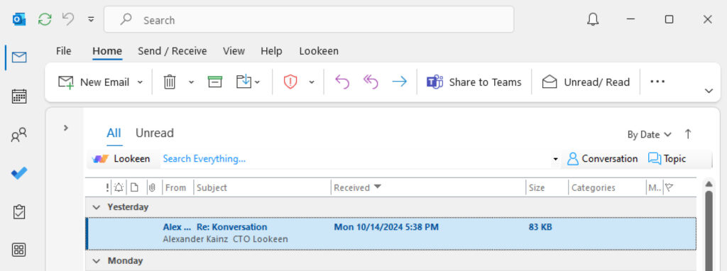 Lookeen is the perfect plugin with hassle-free Outlook integration for you and your company if you need a fast, reliable search solution that can be used directly within Outlook. Whether you’re in the calendar, inbox, or your notes – Lookeen is always just one click away!